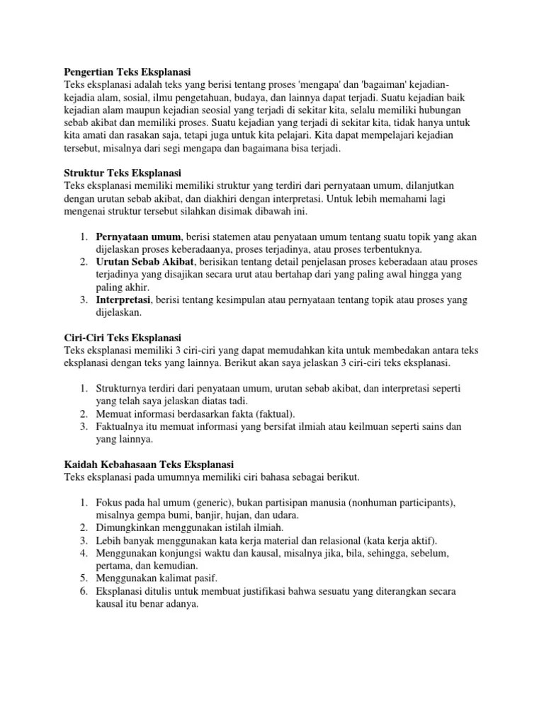 Memiliki/menggunakan sequence markers dalam teks. Menurut pardiyono, teks eksplanasi merupakan teks yang berusaha untuk menjabarkan proses terbentuknya sebuah fenomena alam. Teks eksplanasi yaitu suatu teks yang menjelaskan mengenai bagaimana proses terjadinya serta terbentuknya sebuah fenomena alam maupun sosial. Teks eksplanasi ini berisi penjelasan rinci suatu fenomena. Dikutip dari buku bahasa indonesia untuk smp/mts kelas viii, teks eksplanasi adalah teks yang menjelaskan hubungan peristiwa atau proses . Penjelasan umum yang dituliskan di dalam teks ini berupa gambaran secara umum tentang apa, mengapa, dan bagaimana proses peristiwa alam bisa . Informasi singkat tentang apa yang dibicarakan. Definisi teks eksplanasi secara umum, teks eksplanasi adalah teks yang berisi tentang proses 'mengapa' dan ' . Segala proses yang terjadi akan dijelaskan secara rinci dan logis dalam teks . Sedangkan menurut mahsun ( 2013: Teks eksplanasi merupakan jenis teks yang sering . Contohnya pertama, kedua, ketiga, dan sebagainya. Liputan6.com, jakarta tujuan teks eksplanasi memiliki fungsi tersendiri dalam penggunaanya.